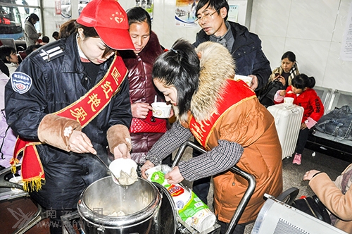 匡紅艷愛心班的“小紅帽”,為旅客送“愛心餃子”。
