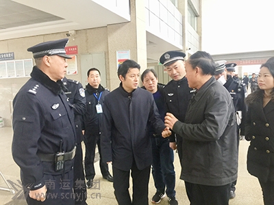 閬中市副市長(zhǎng)、公安局長(zhǎng)祝隆平(左三)檢查閬中客運(yùn)中心春運(yùn)安全工作