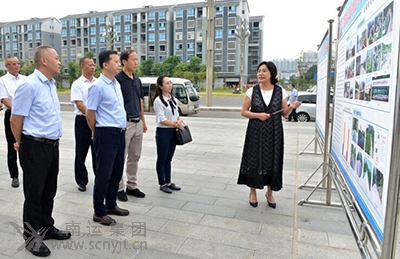 營山縣副縣長楊素梅(左一)在營山汽車客運站站前廣場的展板前,向?qū)巿砸恍薪榻B營山12328助力脫貧攻堅工作開展情況。