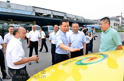 寧堅(右三)一行在營山汽車客運站“金通工程”車輛前,對營山12328助力脫貧攻堅開展情況給予充分肯定。