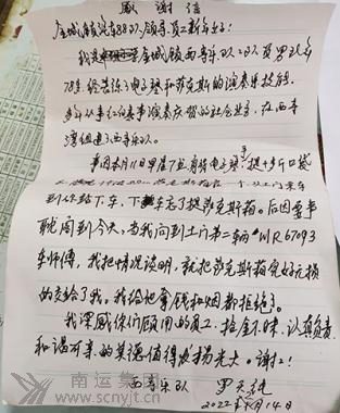 南運集團(tuán)儀隴分公司駕駛員余友和物歸原主 收到《感謝信》