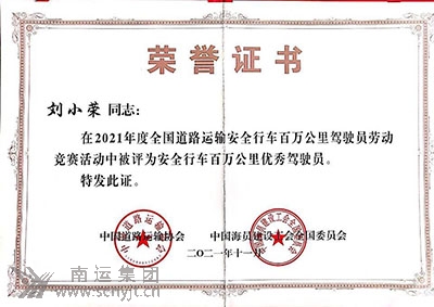 南運集團3名駕駛員榮獲“2021年度全國道路運輸安全行車 百萬公里勞動競賽優(yōu)秀駕駛員”稱號
