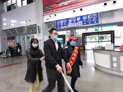 11月13日,寒風(fēng)陣陣,天空下著小雨,明顯比前幾天冷了許多。八點(diǎn)十分左右,兩位旅客站立在南充汽車客運(yùn)站售票廳門口,神態(tài)異常、焦急萬分,該站愛心班站務(wù)人員強(qiáng)燕和鄧雙發(fā)現(xiàn)后立即上前詢問,通過面對面觀察交流,得知兩位旅客都是盲人,他們乘坐出租車來到車站,準(zhǔn)備坐9;30前往隆昌的班車。由于出租車司機(jī)把他們送到站前廣場就離開了,一時之間,他們不知道該往哪里去。身邊又無人陪同,強(qiáng)燕和鄧雙了解情況后,立即開展幫扶行動,一個攙扶兩位盲人旅客,一個用愛心推車將他們的行李搬到推車上,通過安檢直接推送到候車室暫時休息。 九點(diǎn)十分,兩位站務(wù)人員提前通過綠色通道,將兩位盲人旅客送進(jìn)站臺攙扶上車,裝好行李。并告訴駕駛員這兩位旅客的情況,再三叮囑一定要把這兩位盲人旅客送到接站的家人手里。 愛心班站務(wù)人員細(xì)心周到的服務(wù),讓這兩位盲人旅客感激不已,坐上車后,他們緊握著愛心班工作人員的手說道:“謝謝,謝謝你們了!”“不用謝,這是我們應(yīng)該做的。”強(qiáng)燕和鄧雙異口同聲的回答道。目送著班車的發(fā)出,她們又立即返回到自己的工作崗位上,準(zhǔn)備為下一位旅客服務(wù)。 真誠做人、平凡善舉、用心做事,踐行服務(wù)至上的理念,用愛溫暖旅客回家路,是該站愛心班每位成員的優(yōu)良傳統(tǒng)。 (李利 陳春華)