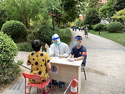 旅游分公司黨員張菁(右一)參加社區(qū)抗疫維護秩序。