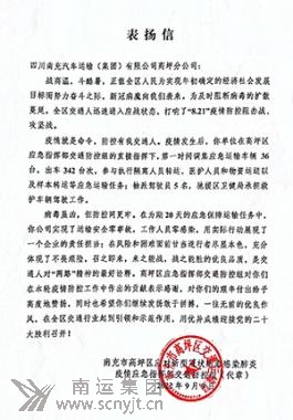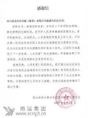 鄧迪還自費為社區(qū)各值守點位捐贈飲用礦泉水十余件,極大的彰顯了南運集團共產黨員在關鍵時刻、危難時刻奉獻社會的先鋒模范作用,社區(qū)大媽們翹起大拇指說:“你們南運人真棒!”8月27日,順慶區(qū)西山街道辦事處伍家埡社區(qū)居民委員會還給南運集團旅游分公司寄來了情真意切的《感謝信》。