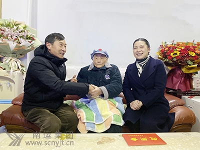 市交通運(yùn)輸局黨委書記、局長劉曉梅(右一)在南運(yùn)集團(tuán)黨委書記、董事長、總經(jīng)理王希平(左一)的陪同下,上門看望慰問南運(yùn)集團(tuán)老紅軍曹守成。