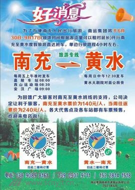 位于重慶石柱土家族自治縣境內(nèi)的黃水森林公園,屬國(guó)家級(jí)森林公園,年平均氣候在18度左右,是重慶市五個(gè)國(guó)家級(jí)森林公園中最年輕、面積最大、唯一的少數(shù)民族旅游風(fēng)景區(qū)。也是廣大旅游愛(ài)好者和夏季清涼避暑休閑的首選旅游景區(qū)。 為滿足廣大旅游愛(ài)好者和夏季清涼避暑休閑的出行需求,南充汽車客運(yùn)站從2023年6月30日起開行南充至黃水的旅游直通車,發(fā)車時(shí)間為每周五上午08:00時(shí)。我們還可以為您提供團(tuán)體出行預(yù)約服務(wù),只為您能度過(guò)一個(gè)愉快而舒適的夏季!如果您想提前了解相關(guān)情況,歡迎廣大旅客通過(guò)電話咨詢:南充汽車客運(yùn)站服務(wù)熱線:0817-3638622 15228141518 溫馨提示: 1.網(wǎng)絡(luò)購(gòu)票請(qǐng)下載“團(tuán)子出行”或“四川汽車客運(yùn)票務(wù)網(wǎng)”。 2.乘車時(shí)請(qǐng)攜帶本人有效身份證件乘車。 (南充客運(yùn)站 彭慶紅) (高客分公司 朱 玲)