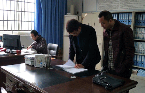 省運(yùn)管局檢查組組長胡濤(中)查閱高速客運(yùn)分公司有關(guān)安全資料