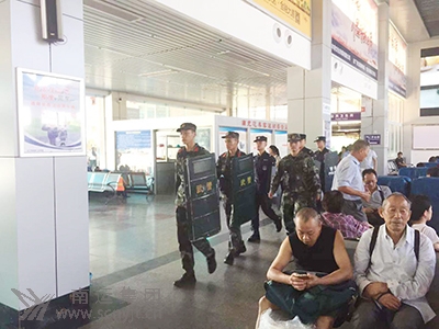 車站派出所公安干警和武警在候車大廳巡邏執(zhí)勤