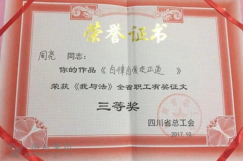 為進(jìn)一步增強(qiáng)廣大職工依法維護(hù)自身合法權(quán)益的知識(shí)和意識(shí),推動(dòng)形成全民學(xué)法、尊法、信法、守法、用法的良好環(huán)境,2017年10月四川省總工會(huì)舉辦了“我與法——全省職工有獎(jiǎng)?wù)魑摹被顒?dòng)。南運(yùn)集團(tuán)旅游分公司工會(huì)干事周亮,創(chuàng)作的《自律自愛走正道》一文榮獲“《我與法》全省職工有獎(jiǎng)?wù)魑?/span>”三等獎(jiǎng)。 (劉紫佳)