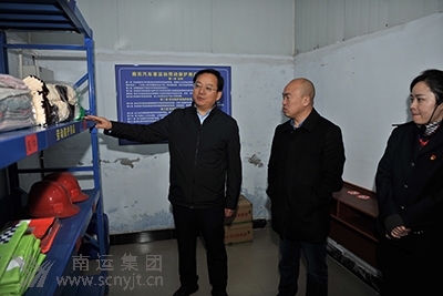省總工會黨組成員、經(jīng)費審查委員會主任張開鋒(左一),市總工會黨組成員、副主席屠繼東(左二),在南充汽車客運站勞保庫房查看職工勞動保護用品庫存情況。