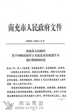 2020年12月底,經(jīng)六屆南充市人民政府第144次常務(wù)會議審議通過,決定對姚長海、唐富業(yè)2名見義勇為先進個人進行獎勵,每人0.5萬元人民幣,并下發(fā)《關(guān)于對姚長海等2名見義勇為先進個人進行獎勵的決定》(南府發(fā)〔2020〕12號)。 姚長海52歲,蓬安人,現(xiàn)為南運集團閬中鴻運運輸有限公司里一名出租車駕駛員。2018年11月26日上午,姚長海在搭乘一名女孩時,發(fā)現(xiàn)該女孩滿面淚痕,于是他在途中勸導(dǎo)女孩,可對方并不回應(yīng),女孩下車時將車費交到姚長海手中便迅速離去。姚長海感覺情況異常,于是將車停在路邊,下車尋找女孩。在尋至嘉陵江邊時,姚長海發(fā)現(xiàn)女孩已經(jīng)跳江,于是他奮不顧身躍入冰冷的江水中奮力施救,最終在岸上群眾的幫助下把輕生女孩救上岸,讓正處花季的生命得以延續(xù)。 姚長海不但多次見義勇為,他在平時的營運過程中也始終堅持做到扶老攜幼、熱情服務(wù)、文明待客,從不欺客宰客、從不拒載;凡拾到乘客遺失的物品,他都立即聯(lián)系失主或上交公司;每年高考,他都積極參加公司組織的免費送考服務(wù);在同事遇到困難時,他都會出手幫一把。他總是說:“誰沒有困難的時候,自己能幫一把就幫一把”。 姚長海在寒冷的嘉陵江中將17歲輕生女孩救上岸的英勇壯舉在《中央電視臺》《人民日報》《新華社》《新京報》《四川日報》等全國300多家新聞媒體和網(wǎng)絡(luò)平臺廣為報道,在全中國產(chǎn)生了廣泛的影響;他見義勇為和平時拾金不昧及助人為樂的先進事跡感動了社會,獲得了應(yīng)有的榮譽和獎勵。他曾入選“2018年感動南充十大新聞人物”,先后被評為“閬中好人”、“最帥的哥”,并獲得阿里巴巴“2018年度正能量人物”和獎金1萬元;2019年他被評為“四川好人”,2020年獲得南充市政府的表彰和獎勵。 姚長海作為南運集團出租車駕駛員,為南充出租行業(yè)爭了光,為社會、也為出租車駕駛員及公司員工樹立了良好的榜樣。希望廣大員工向姚長海同志學(xué)習(xí),做一個樂于助人、道德高尚、受人尊敬的人,為提升企業(yè)形象、建設(shè)平安南充作出新的更大貢獻。